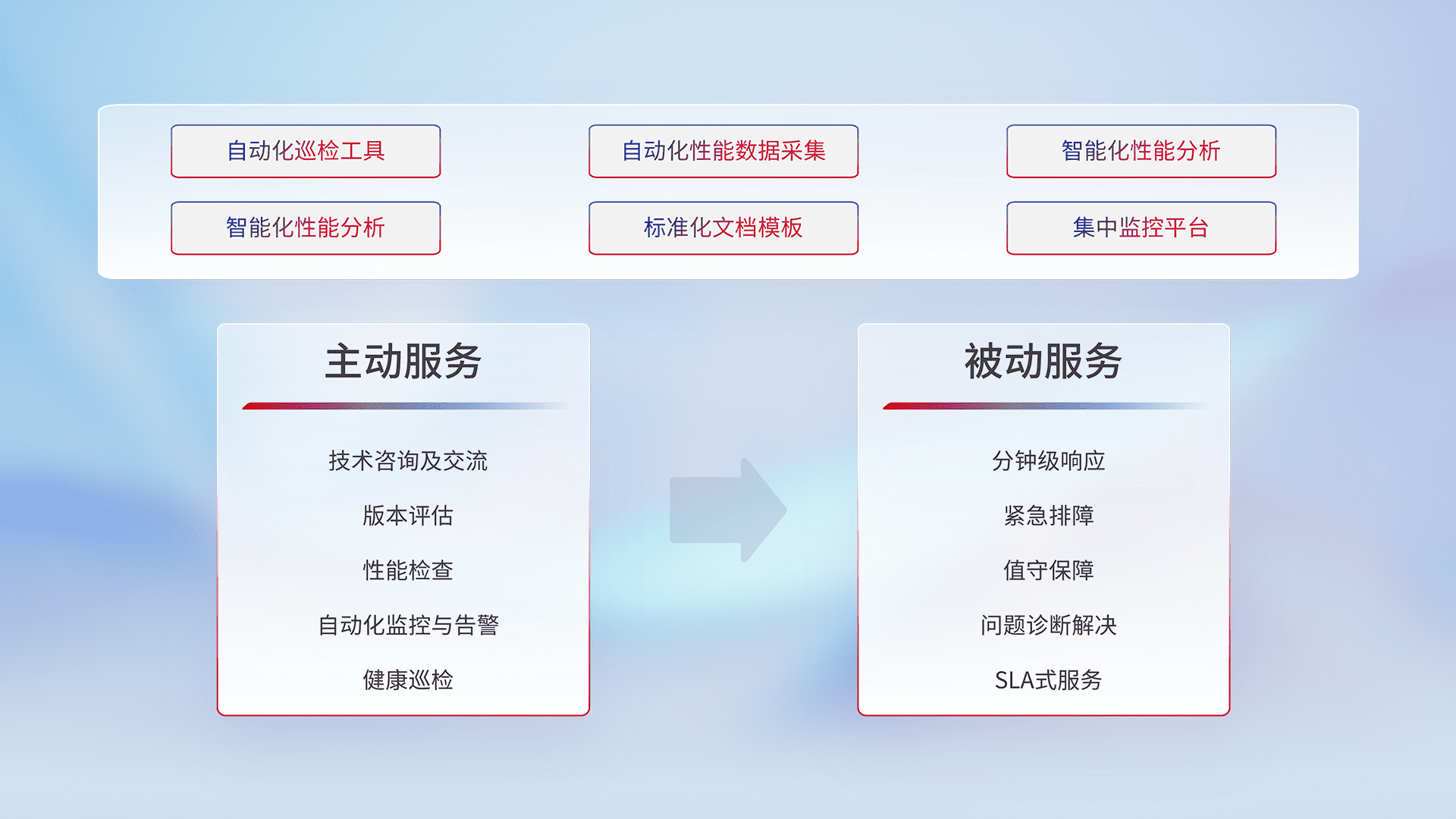 智能化工具和标准化文档,,,保障服务质量,,,,提供主动服务(包含技术咨询、、版本评估、、、、性能检查、、、、自动化监控与告警、、、、健康巡检)和被动服务包含(分钟级响应、、紧急排障、、值守保障、、、、问题诊断解决、、SLA服务)。。。